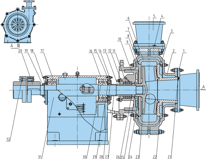 1、入口短管 2、前泵蓋 3、前護板 4、O型橡膠密封圈 5、出口短管 6、護套 7、后泵蓋 8、O型橡膠密封圈 9、后護板 10、填料箱 11、油浸石棉盤根F19 12、填料壓蓋 13、軸套 14、拆卸環(huán) 15、軸承壓蓋 16、軸承上蓋 17、向心推力球軸承 18、甩水環(huán) 19、拼冒 20、聯(lián)軸器 21、O型橡膠密封圈 22、O型橡膠密封圈 23、葉輪 24、副葉輪 25、0型橡膠密封圈 26、O型橡膠密封圈 27、調(diào)整套 28、甩水環(huán) 29、骨架油封 30、短圓柱滾子軸承 31、4號泵座 32、彈性具銷